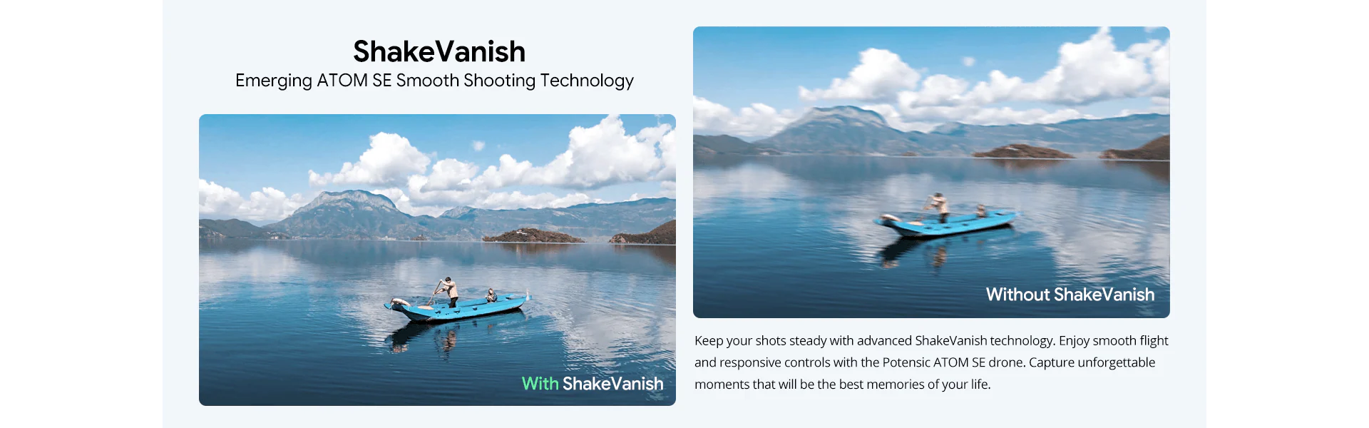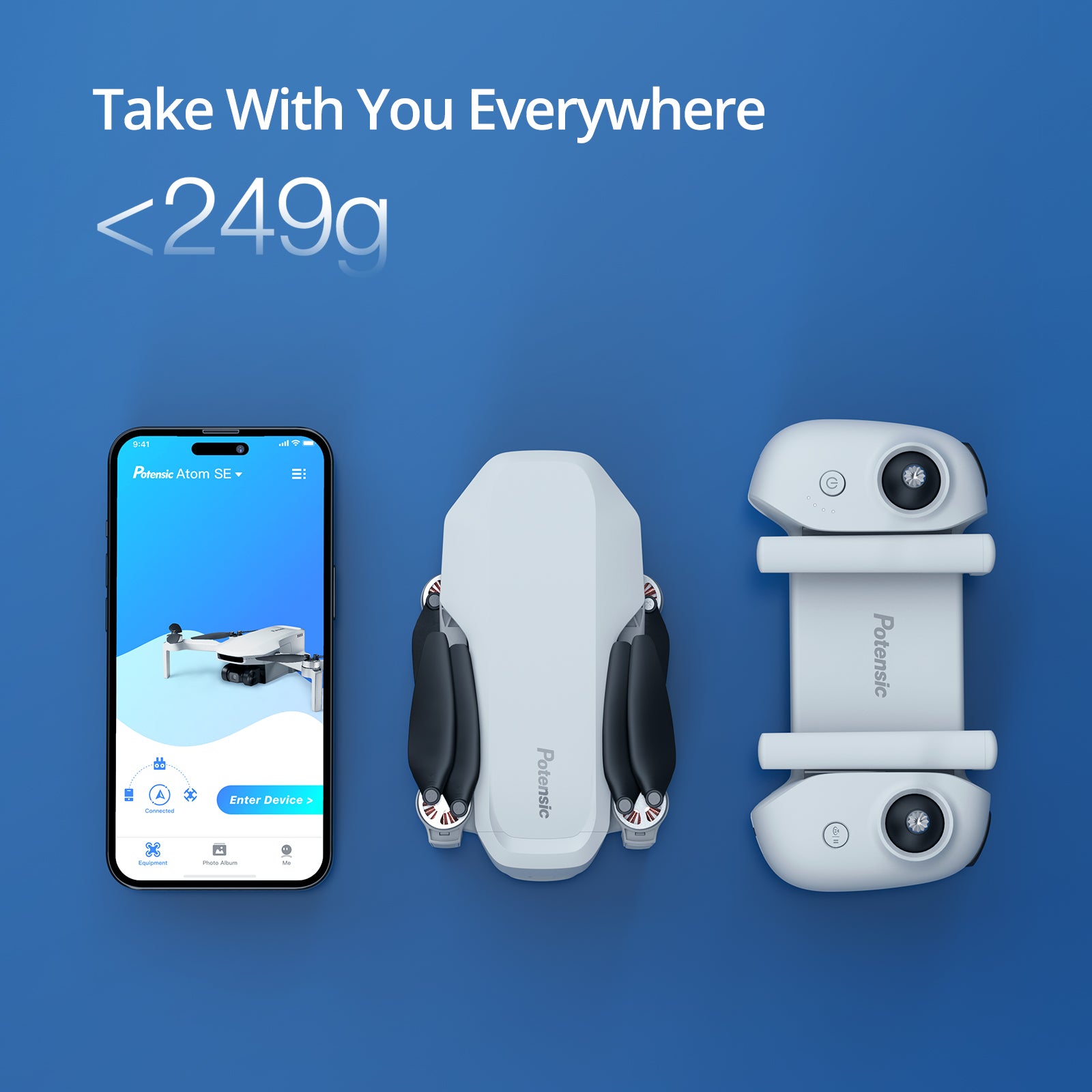 The ATOM SE drone weighs under 249g (0.55 lbs), making it as lightweight as a smartphone and portable enough to fit in your pocket. With a wind resistance of up to scale 5 and a maximum takeoff altitude of 4KM, the ATOM SE delivers stable footage even in windy conditions.